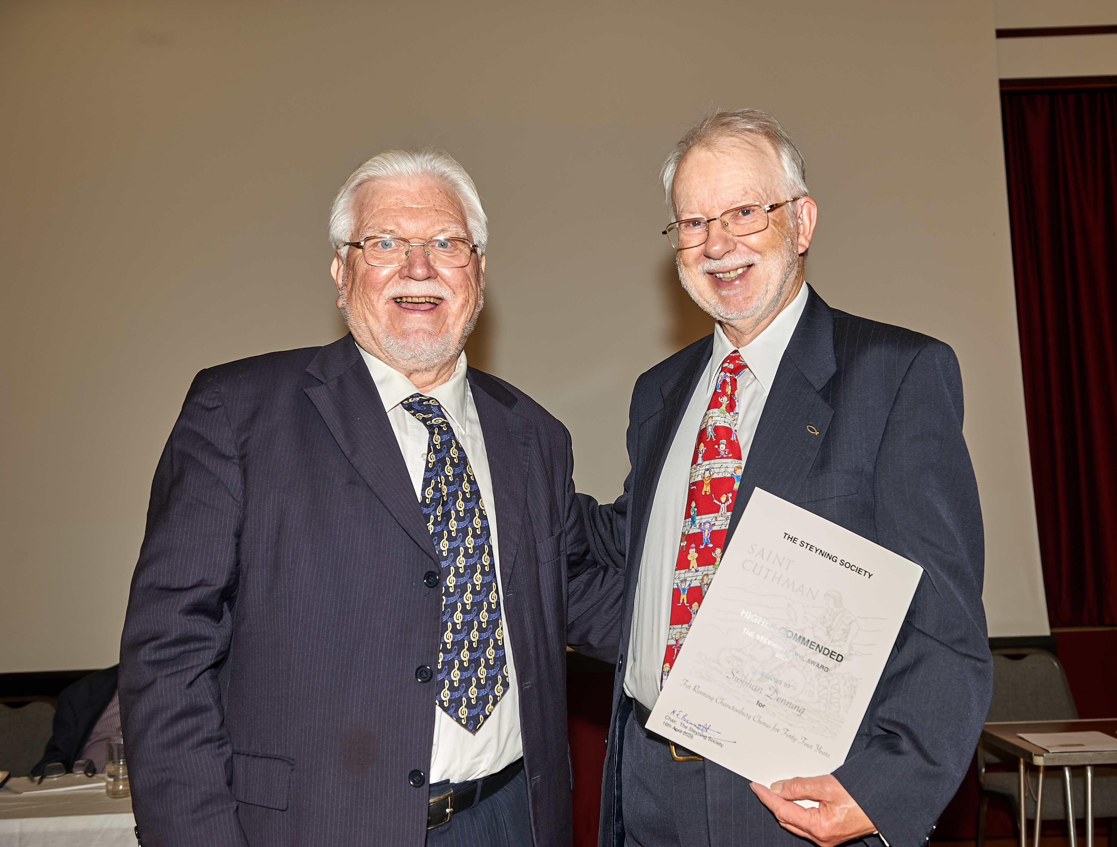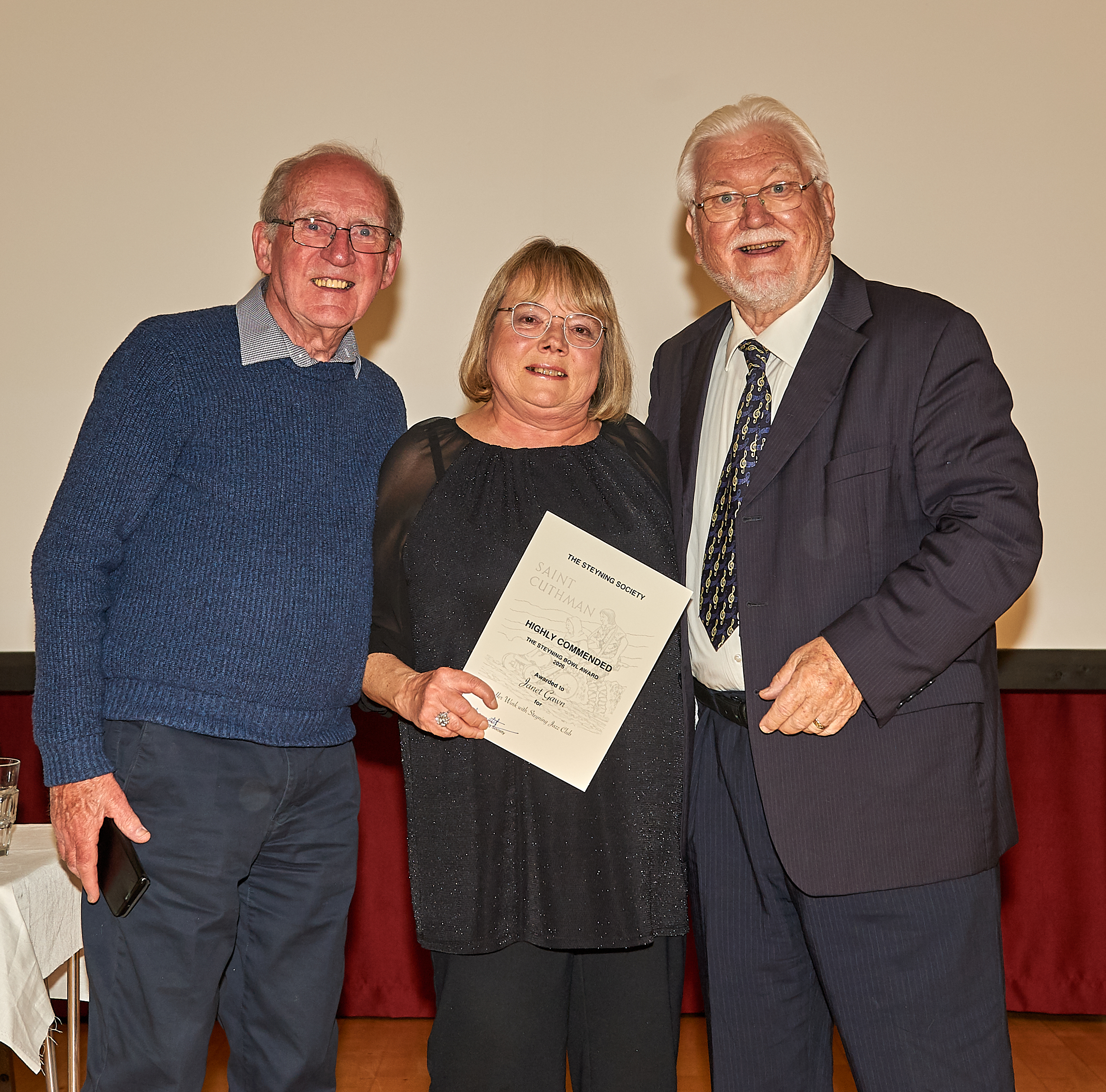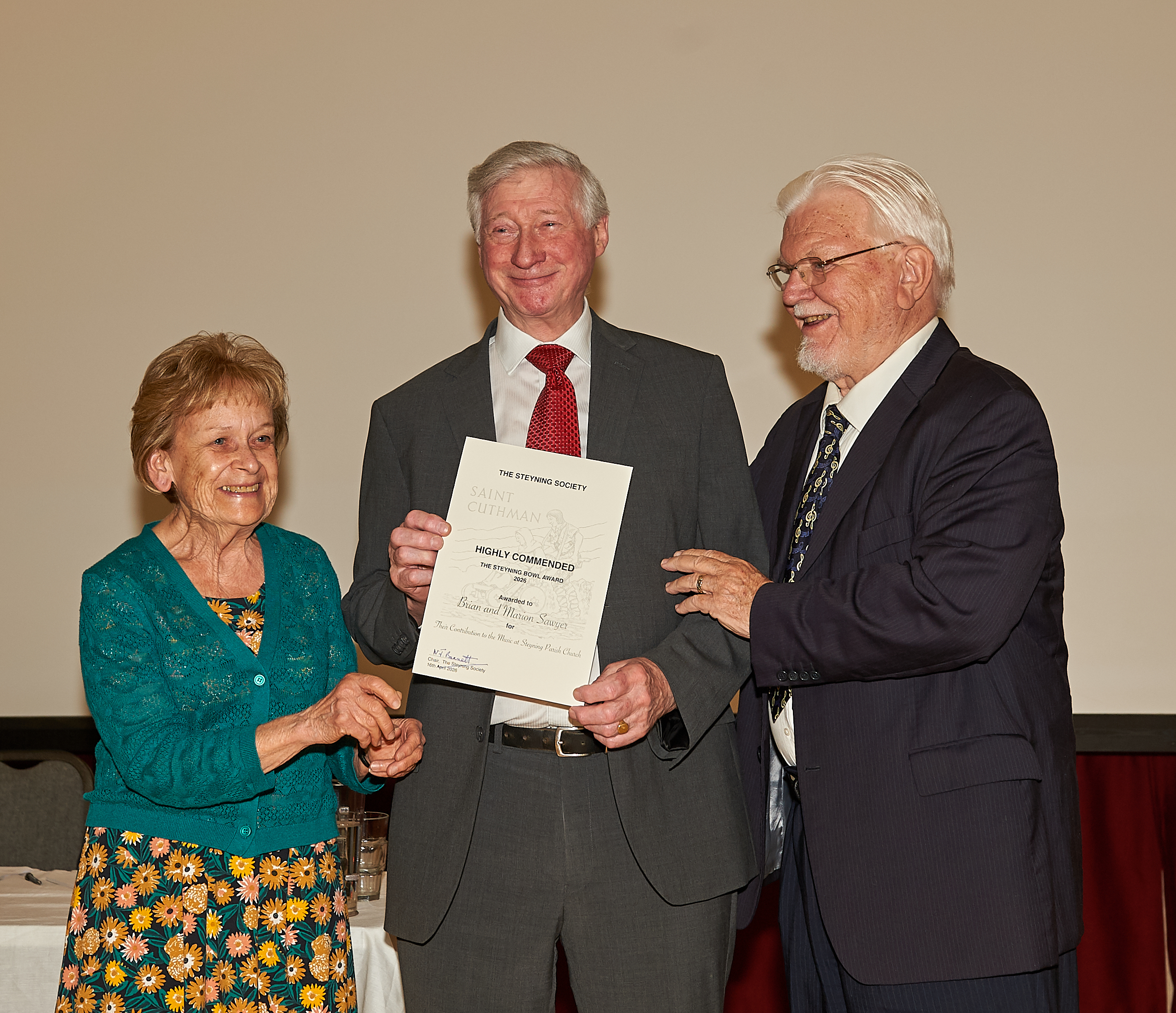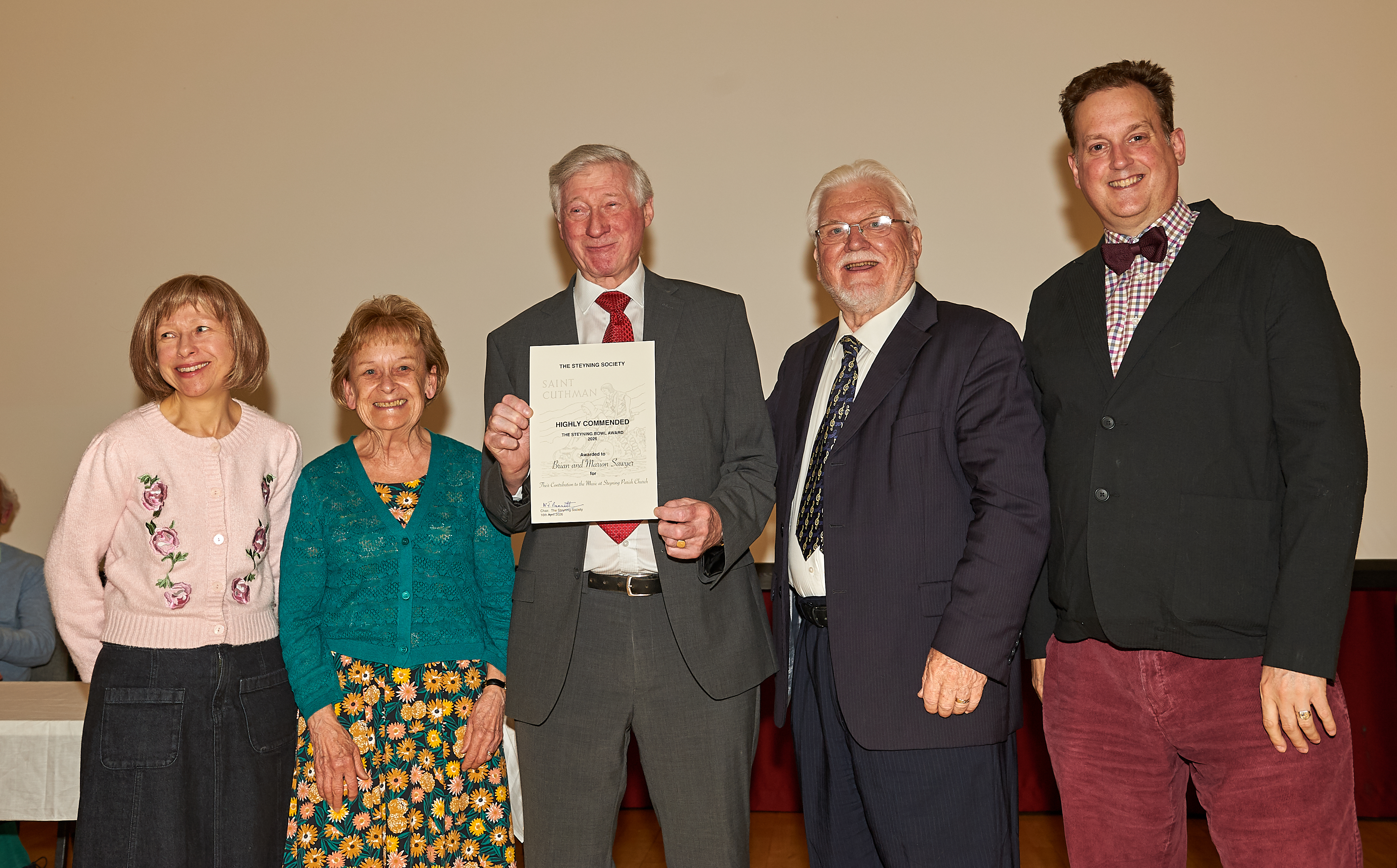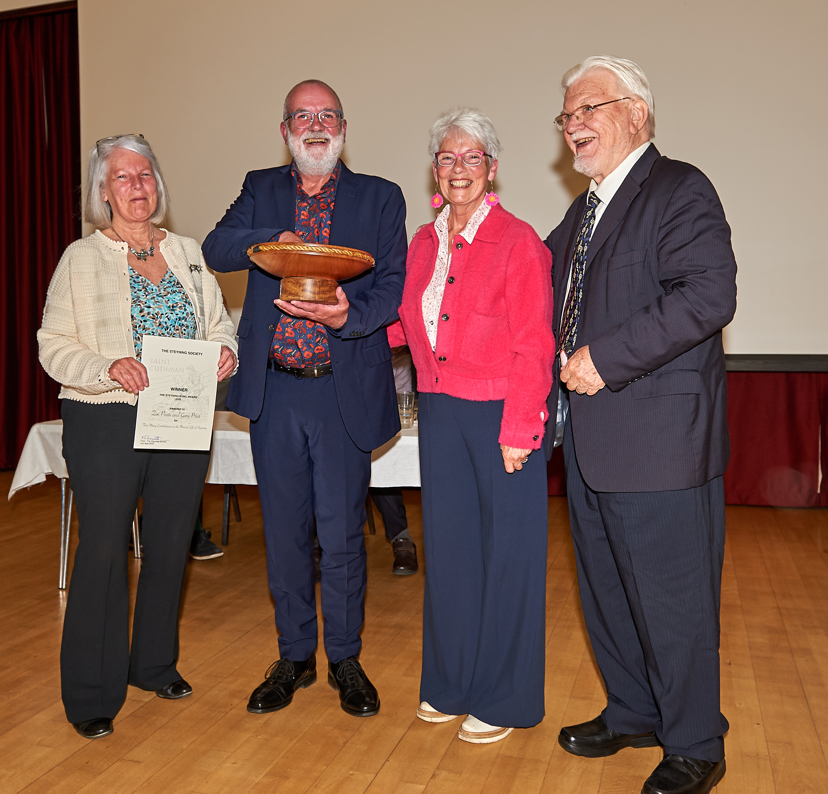 The Bowl was presented to Zoe Peate and Gary Prior for their lifetime commitment to music, and especially for their work with Cantatrice Voices and Kaleidoscope Singers. Each of the five runners up received Highly Commended Certificates. They were Siobhan Denning, for her work with Chanctonbury Chorus, Diane Gargano for her work with Strummers and Singers, Janet Gawn for her work with Steyning Jazz Club, Christabel Heasman-Cossins for her work with Sing Out Sister and Brian and Marion Sawyer for their contribution to music at Steyning Parish Church.